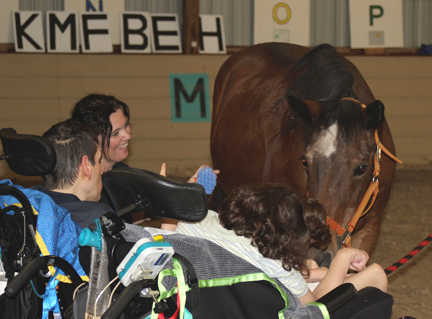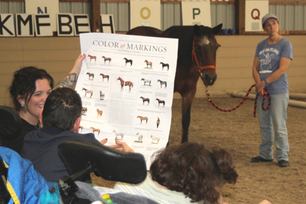 You don’t have to ride a horse to experience their healing nature. Interacting with them face-to-muzzle on the same level proves to be just as rewarding. This past year 46 people, non-ambulatory and with significant intellectual and physical disabilities, from Pony Bird residential care facility partook in Unmounted Activities a newly expanded service at Ride On St. Louis. Each week groups of six would visit Ride On St. Louis for the two hour experience that operated up close and personal with staff, horses and residents in our indoor arena. The specialized dust free and easy to tread footing in our indoor arena truly makes this precious experience possible with ease of navigation for the residents, who all require wheelchairs for mobility. Inquisitive horses sink their faces into laps or wait quietly for their guests to reach up for a pat or try a bit of brushing. Clients in Unmounted Activities see, smell, hear and touch their way through horsemanship with activities that cover equine diet, grooming, caring for hooves, and education in coat colors and breeds to live demonstrations of gait patterns and riding.