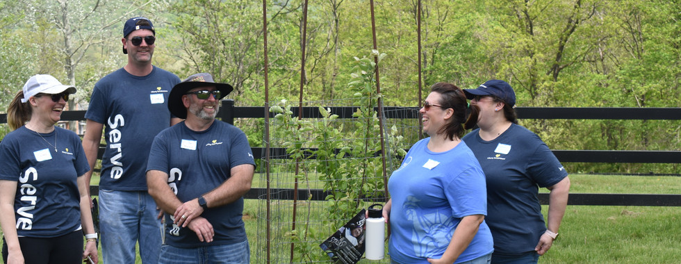 The team didn’t stop there. They jumped in to weed and reestablish protective cages around our young trees, helping ensure the orchard's continued health and growth. They also tackled an urgent repair to our storage building, where recent storms had left us with rotten boards, bent roofing panels, and leaks that created a soggy mess inside. Thanks to their skills, the roof is now repaired and sturdy — no more shaking in the wind! As a bonus, some volunteers even rolled up their sleeves to help stain the rafters in our barn extension, moving us one step closer to completing that important project.